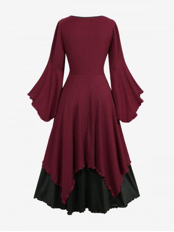 Plus Size Two Tone Textured Belted Layered A Line Flare Sleeves Dress - Deep Red - 4x | Us 26-28