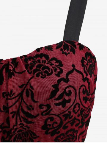 Plus Size Vintage Flower Layered Ruched Mesh A Line Dress - Red - L | Us 12