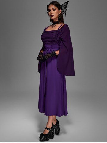 a*****y5Plus Size Medieval Renaissance Ruched Two Tone Mesh Sleeves A Line Midi Belt DressColor: CONCORD Size: 1X | US 14-16OH MY HEART!!! This is going to be PERFECT for renfaire ... I immediately threw on my elf ears and opted for a photo shoot. I ordered it one size bigger and I should NOT have -- exchange is difficult so I am just going to