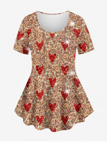 Plus Size Glitter Sparkling Sequins Heart Print Valentines Short Sleeves T-shirt - Coffee - 1x