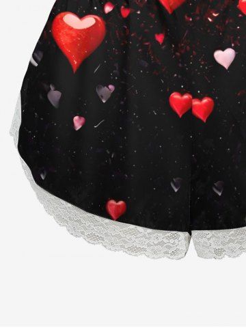 Plus Size Heart Print Valentines Lace Trim Pajama Shorts - Black - 2xl