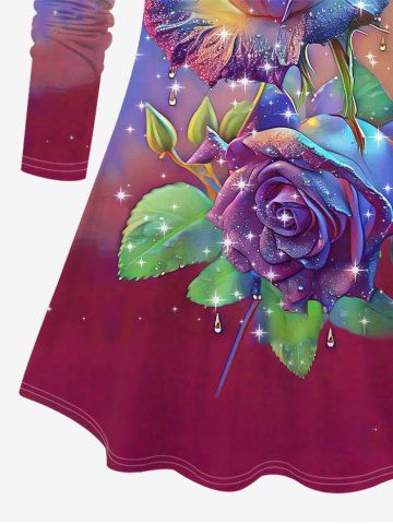 Plus Size > Plus Size Ombre Colorblock Rose Flower Leaf Glitter 3D Print Long Sleeve T-shirt