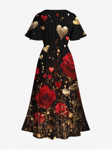 Plus Size > Plus Size Rose Flower Glitter Heart Print Valentines Split Pocket A Line Midi Dress