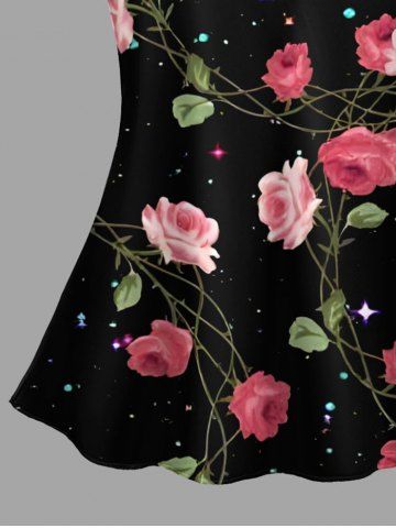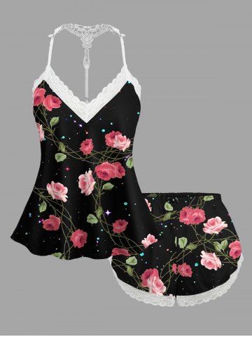 Plus Size Rose Flower Vine Print Lace Trim Crochet Valentines Pajama Top - Black - L
