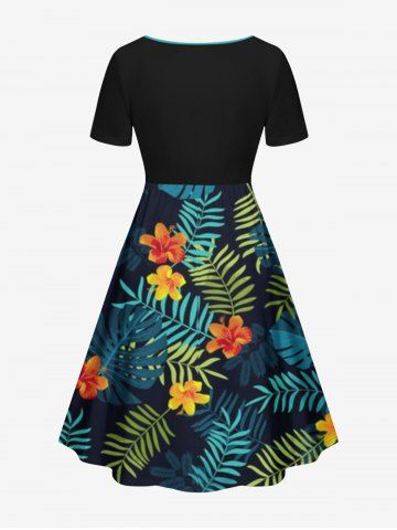 Plus Size Troipical Flower Leaf Print Cinched Hawaii Dress - Black - 3x
