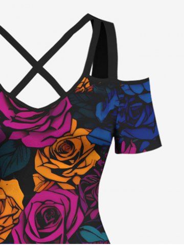 Plus Size > Plus Size Valentine's Day Colorful Rose Flowers Print Cold Shoulder Crisscross Maxi Dress