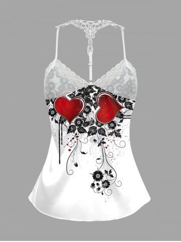 Plus Size Valentine's Day Flowers Leaf Heart Print Lace Trim Strappy Slip Pajama Top - White - S