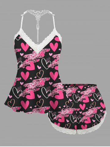 Plus Size > Plus Size Valentine's Day Heart Graffiti Print Lace Trim Strappy Slip Pajama Top