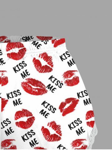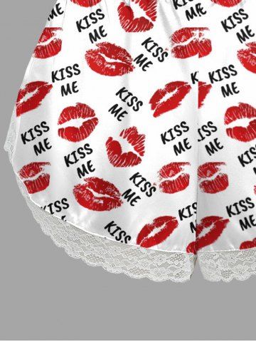 Plus Size Valentine's Day Kiss Me Lips Print Lace Trim Slip Pajama Shorts - White - 5xl