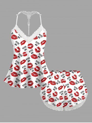 Plus Size Valentine's Day Kiss Me Lips Print Lace Trim Strappy Slip Pajama Top - White - 4xl