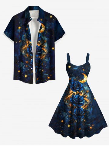 Plus Size Valentine's Day Rose Flower Galaxy Moon Print Tank Dress - Navy Blue - Xxs