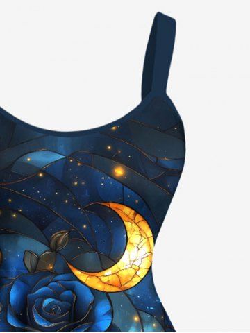 Plus Size Valentine's Day Rose Flower Galaxy Moon Print Tank Dress - Navy Blue - 5x