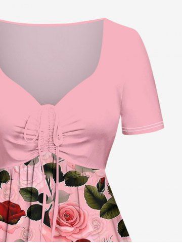 Plus Size Valentine's Day Rose Flower Leaf Print Cinched Dress - Light Pink - 3x