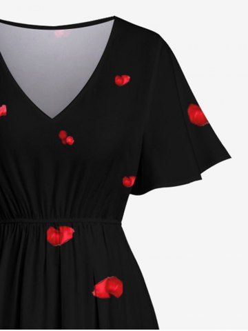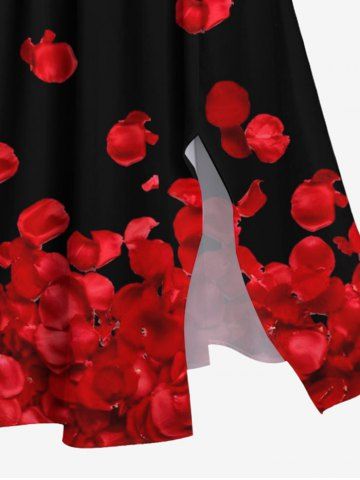 Plus Size Valentine's Day Rose Flower Petal Print Split Midi Dress - Black - 5x
