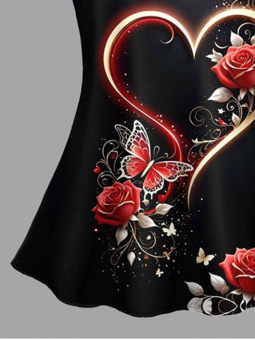 Plus Size Valentine's Day Rose Flowers Butterfly Heart Print Lace Trim Strappy Slip Pajama Top - Black - 5xl