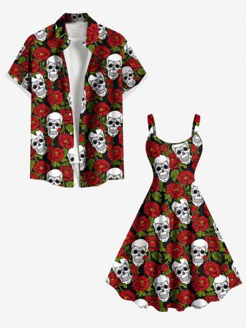 Plus Size Valentine's Day Skull Rose Flower Print Tank Dress - Red - M