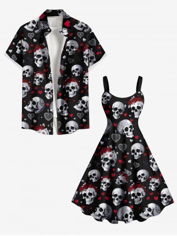 Plus Size Valentine's Day Skulls Heart Rose Flower Print Tank Dress - Black - M