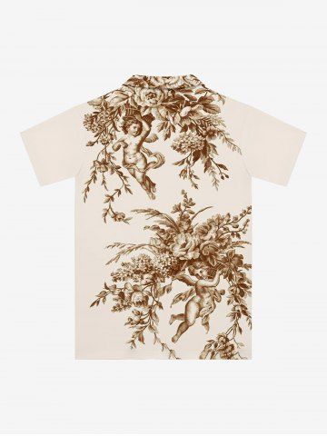 Plus Size Angel Flower Leaf Branch Print Zipper Polo Shirt For Men - Brown - S