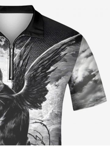 Plus Size Cat Wing Rose Flower Skull Cloud Sky Print Zipper Polo Shirt For Men - Black - M