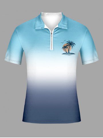Polos > Plus Size Coconut Tree Sun Bird Ombre Print Zipper Hawaii Polo Shirt For Men