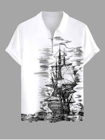 Plus Size Cruise Sailboat Sea Waves Print Zipper Polo Shirt For Men - White - S