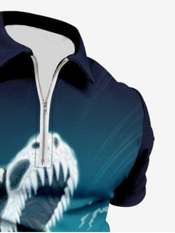 Plus Size Dinosaur Skeleton Ombre Sky Print Halloween Zipper Turn-down Collar Polo Shirt - Deep Green - M