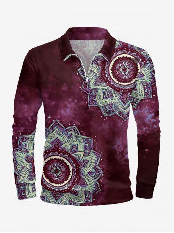 Polos > Plus Size Galaxy Tie Dye Flowers Print Zipper Polo Shirt For Men