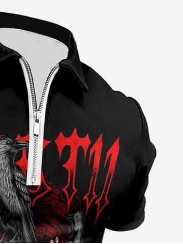 Plus Size Skull Crow Cross Letters Print Halloween Zipper Turn-down Collar Polo Shirt For Men - Black - 3xl