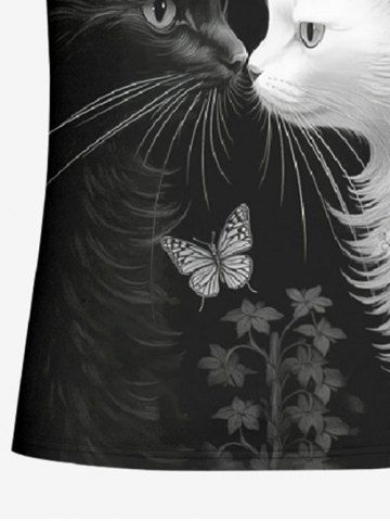 Plus Size Two Tone Cat Butterfly Floral Print Half Zipper Polo Shirt For Men - Black - L