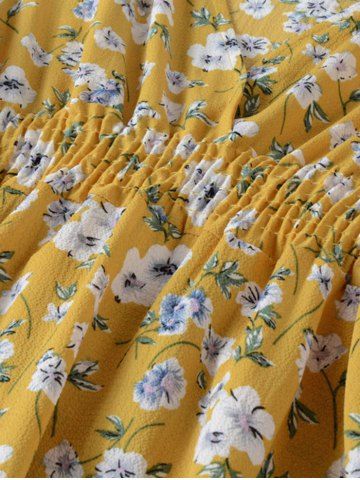 Allover Floral Print Surplice High Waisted Plunging Neck A Line Midi Dress - Yellow - M