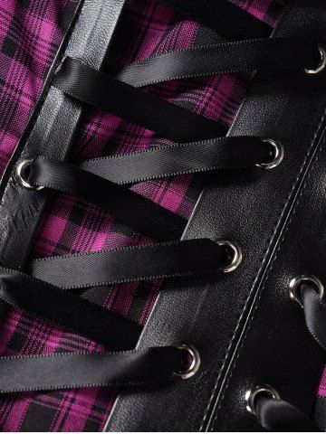Check Print Lace Up Sleeveless Zip Back Lace Hem Mini Dress - Purple - M