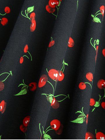 Cherry Leaf Print Tie Bowknot Ruched Panel Tank Dress - Black - M