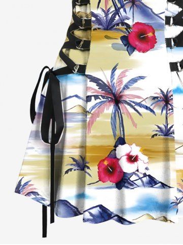 Coconut Tree Hibiscus Floral Sea Mountain Print Hawaii Lace Up A Line Tank Dress - Yellow - Xl
