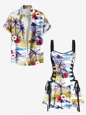 Coconut Tree Hibiscus Floral Sea Mountain Print Hawaii Lace Up A Line Tank Dress - Yellow - Xxxl