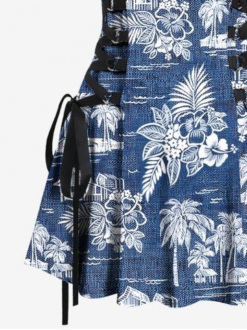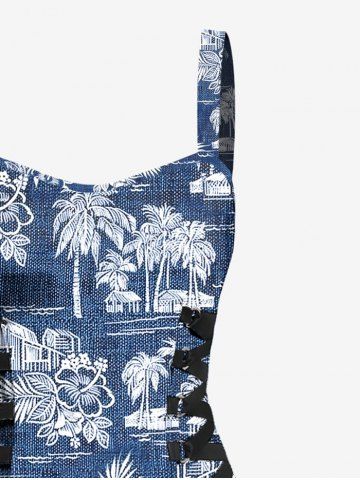 Coconut Tree Tropical Leaves Floral Seascape Lmitation Denim Print Hawaii Lace Up A Line Tank Dress - Blue - S