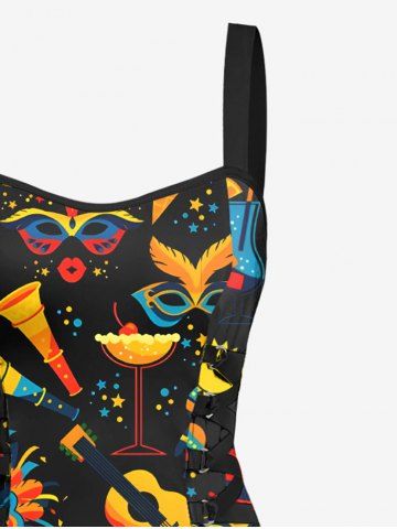 Colorful Mask Guitar Sun Print Hawaii Mardi Gras Lace Up A Line Tank Dress - Black - M