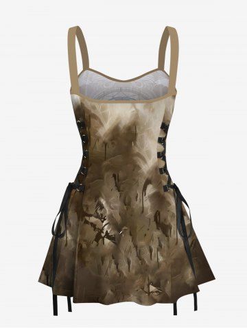 Distressed Skull Dreamcatcher Feather Wing Print Hawaii Lace Up A Line Tank Dress - Coffee - M