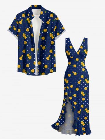 Flower Pin Dot Print Hawaii Ruffles Split Dress - Navy Blue - Xxxl