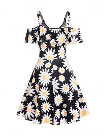 Flower Print Cold Shoulder Ruffle High Waisted Lace Up A Line Mini Dress - Black - L