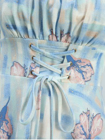 Flowers Plaid Print Lace Up Waist Ruffles Ruched Puff Sleeves Dress - Powder Blue - M