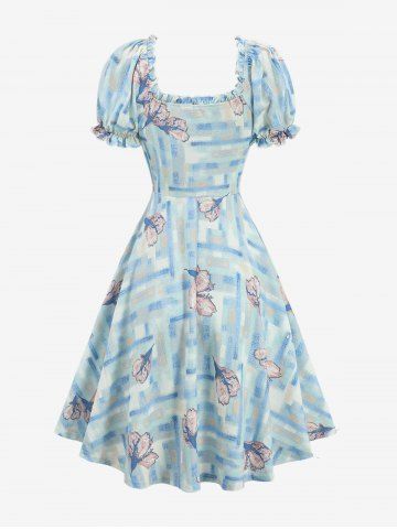 Flowers Plaid Print Lace Up Waist Ruffles Ruched Puff Sleeves Dress - Powder Blue - Xxl