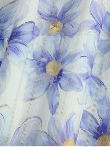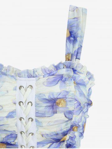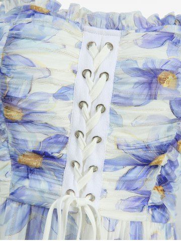 Flowers Print Grommets Lace Up Ruffles Ruched Tank Dress - Blue - L