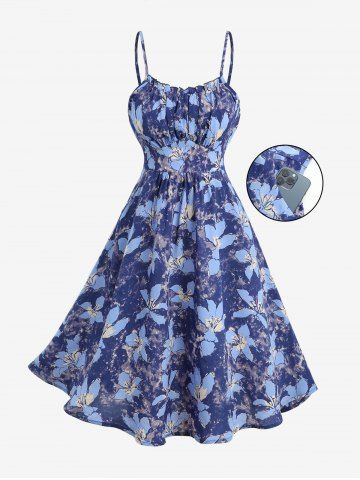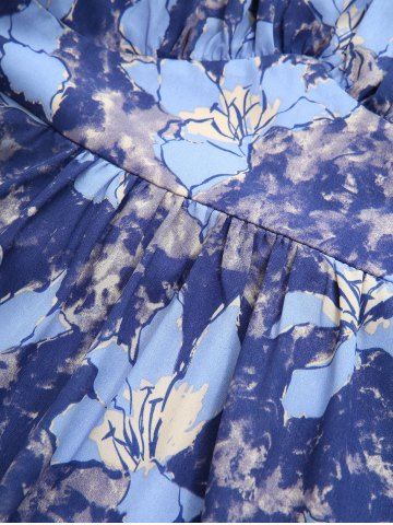 Flowers Tie Dye Print Ruched Ruffles Cami Dress With Cinched Surplice Top - Deep Blue - S