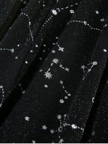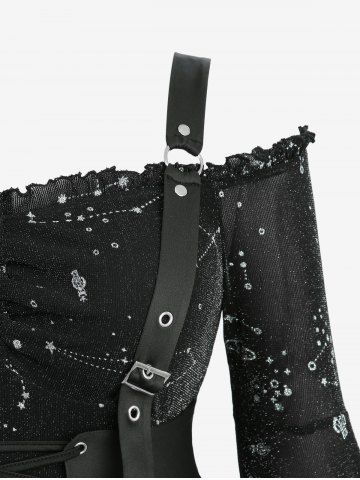 Galaxy Silver Print Lace Up Panel Ruffles Flare Sleeves Asymmetrical Cold Shoulder Dress - Black - Xxl