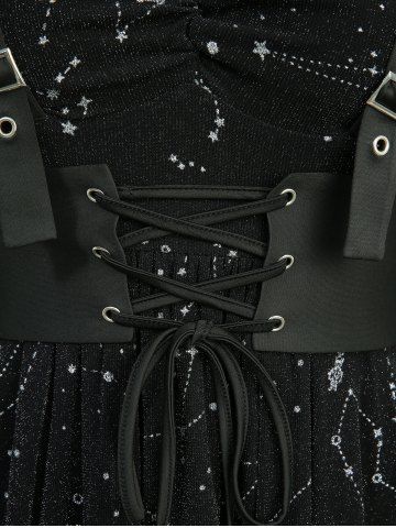 Galaxy Silver Print Lace Up Panel Ruffles Flare Sleeves Asymmetrical Cold Shoulder Dress - Black - Xxxl