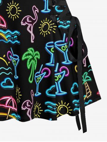 Glitter Neon Coconut Tree Flamingo Juice Print Hawaii Lace Up A Line Dress - Black - Xxl