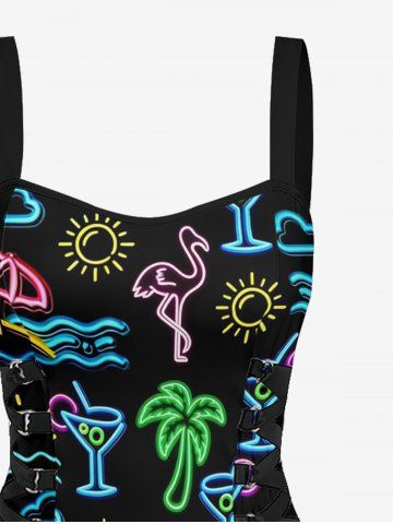 Glitter Neon Coconut Tree Flamingo Juice Print Hawaii Lace Up A Line Dress - Black - Xxxl