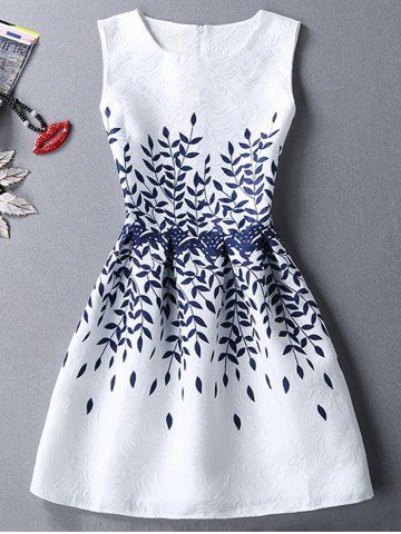Ladylike Round Neck Sleeveless Leaves Print Pleated Women's Dress - White - L