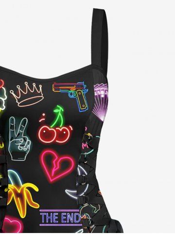 Neon Flamingo Cherry Banana Heart Moon Wing Cloud Print Hawaii Lace Up A Line Tank Dress - Black - L