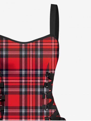 Plaid Print Lace Up Tank Dress - Red - Xxl